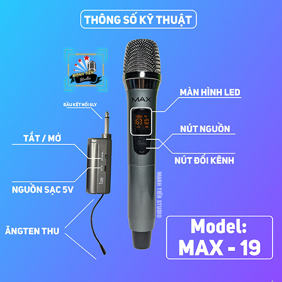 – Mic không dây Max19 hoạt động trên băng tần UHF, được cải tiến hơn rất nhiều so với các sản phẩm trước cho thời gian sử dụng lâu hơn, độ ổn định cũng tốt hơn. Micro rất nhạy, âm ra rất nhẹ, hút tiếng mic rất tốt với mức giá khá mềm, là sự lựa chọn cực kì hợp lý không phải lo dây lằng nhằng, bị rối cho mọi gia đình.